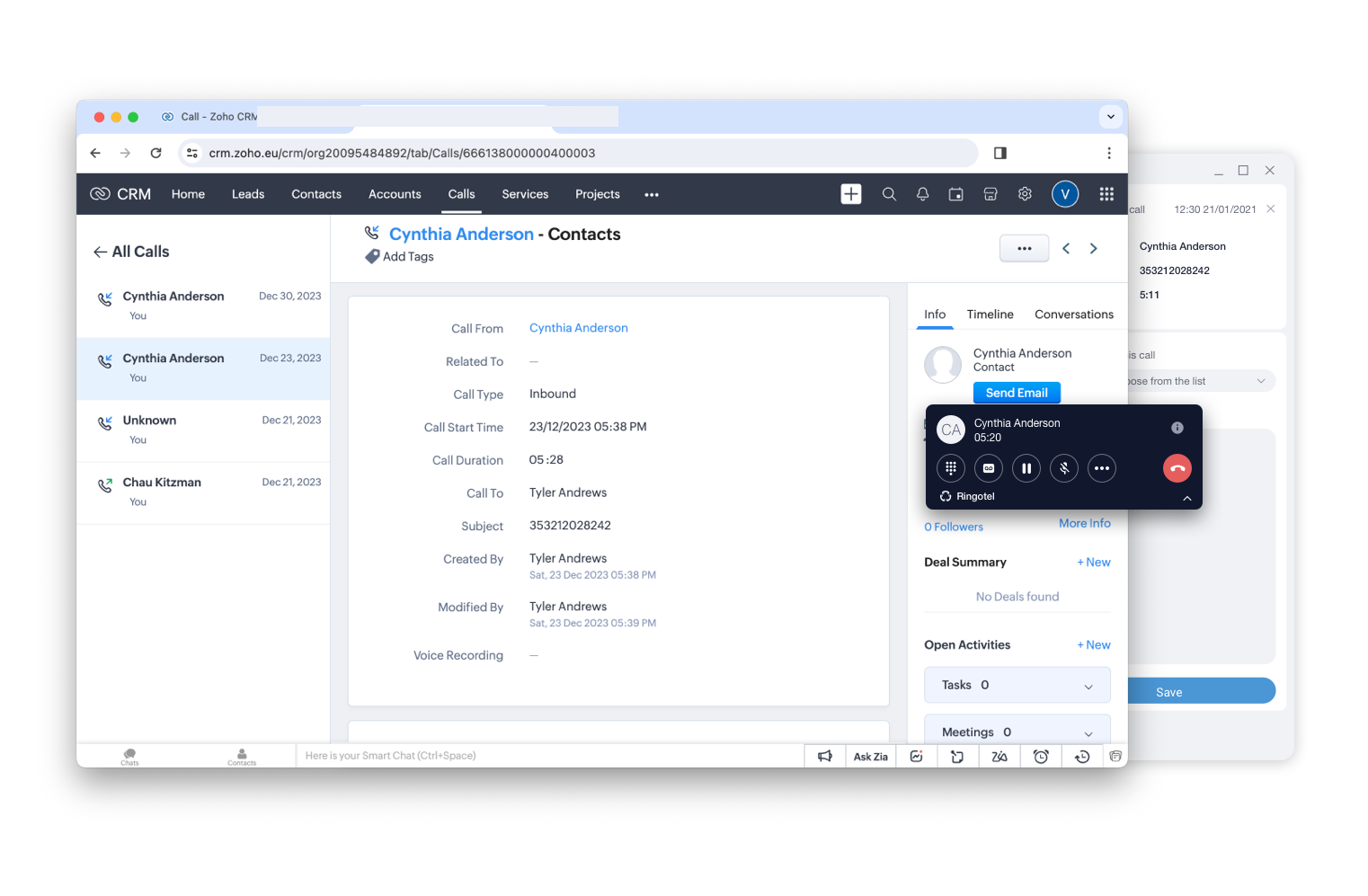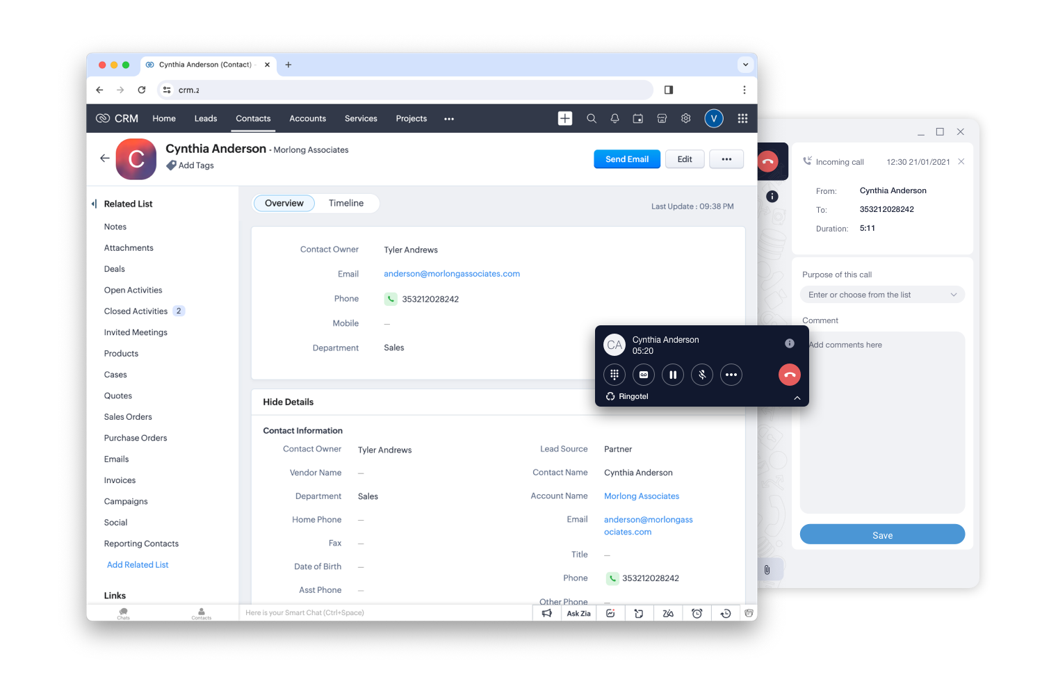 Ringotel automatically generates Phone Call entities in Zoho CRM for every incoming or outgoing call with the ability to add context to each conversation by pre-populating the call subject and call comment fields in Zoho CRM with relevant information.